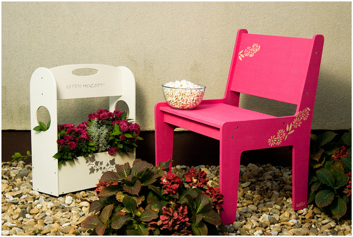A kerti pad és szék 15 mm vastag vízálló ragasztású rétegelt falemezből készülnek, színes akrilfestékkel felület kezelve.
